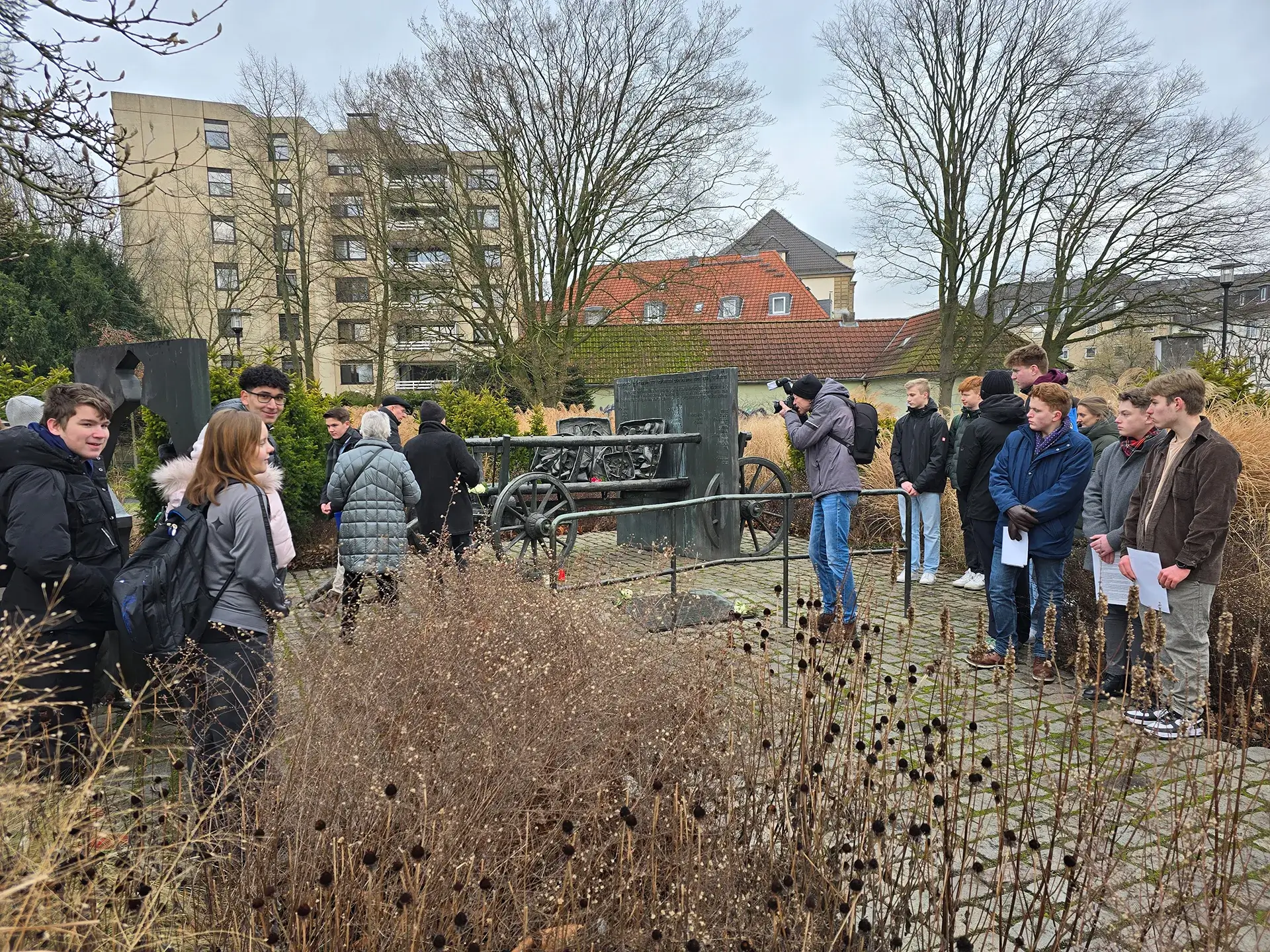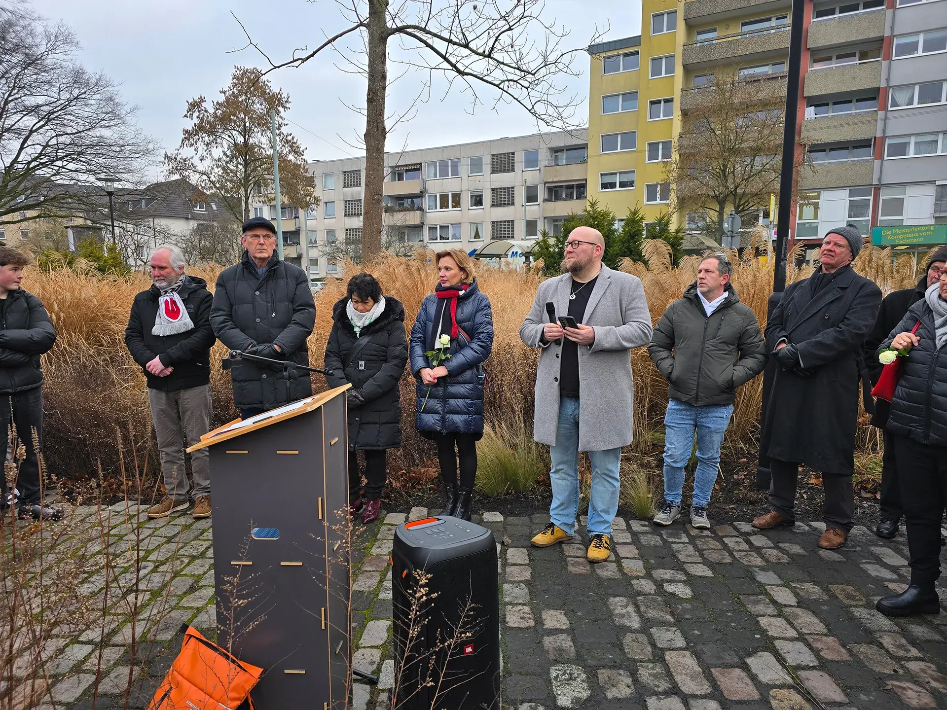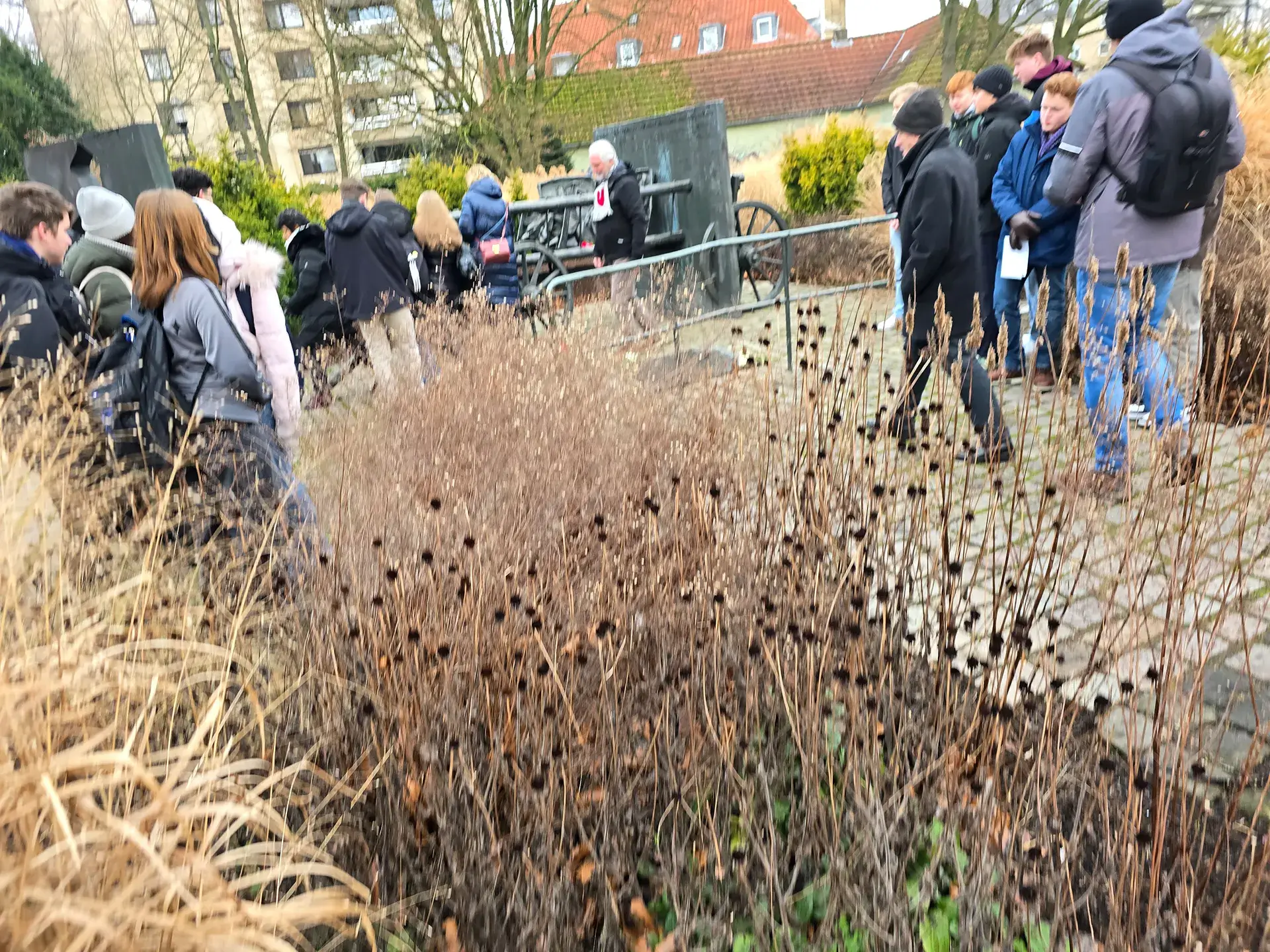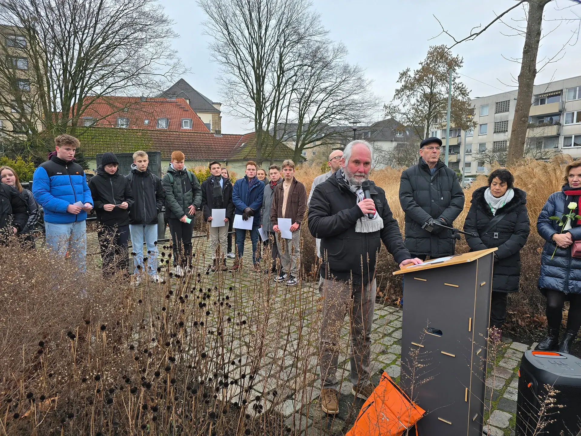 Aus Anlass des Gedenktages gegen das Vergessen und zum Gedenken für die Opfer des Nationalsozialismusses am 27. Januar 1945, an dem die Rote Armee das Vernichtungslager Ausschwitz befreite, fand am Mahnmal „Leiterwagen“ von Alfred Grimm im Stadtpark am 27. Januar 2026 um 10.00 Uhr eine Gedenkfeier statt.